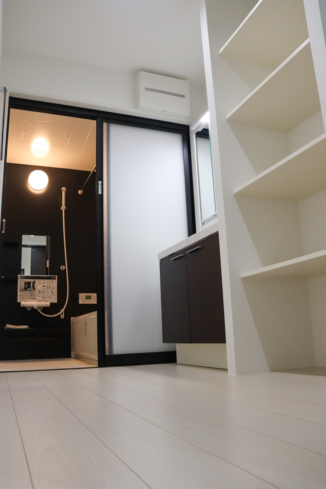 当建売住宅の特徴として脱衣室は広く3帖で、子供さんが多い家庭でもゆとりのあるスペースを確保、またリビングは物干しワイヤー(伸縮type)を標準設置しているので、お昼間の温かい日差しを利用した室内干しが可能になっています!!