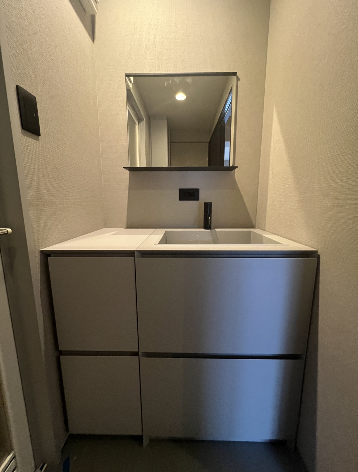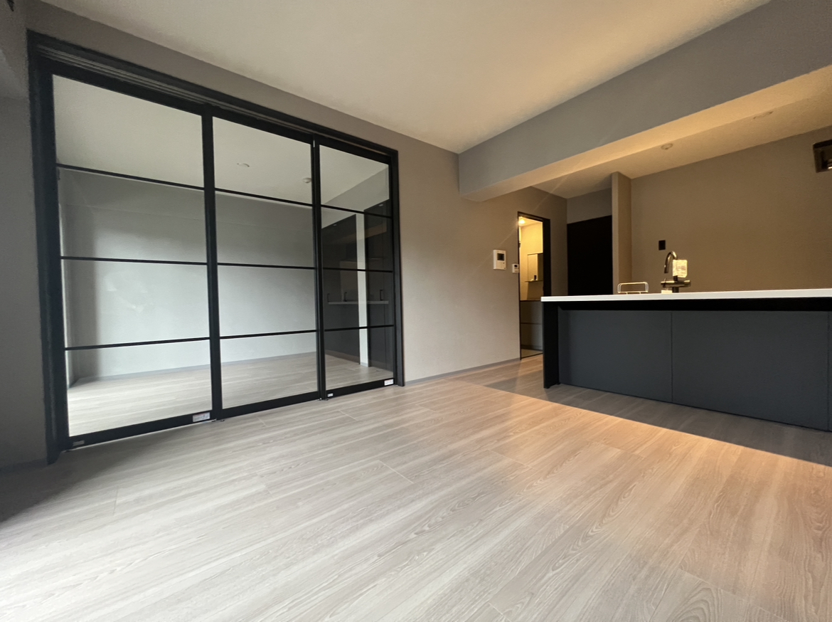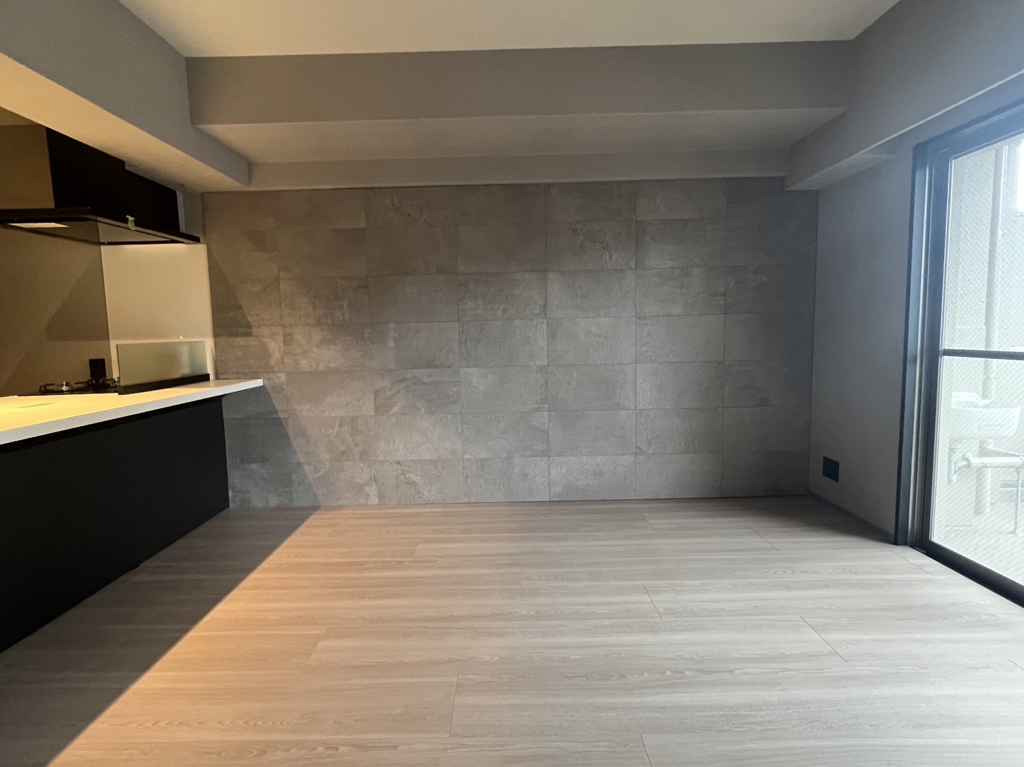 - 築18年、フローリングカバー工法、キッチン、洗面台、木建具、トイレの取り替え、クロス張り替えを行いました。リビングの壁にタイルを貼り高級感を出しています。グレーとブラックを基調にデザインをし内覧会では見学に来られた方から高評価を頂きました。洗面台もデザイン性のあるサンワカンパニーの物と造作物を合わせているので広々と使用できる様にしています。当社不動産部にて販売しております。