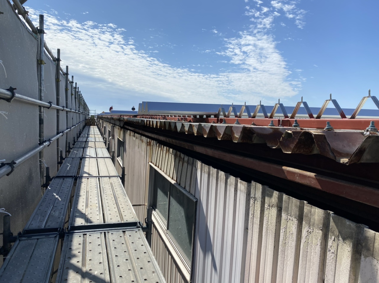 軒先側は屋根が建物から外れてブカブカと浮いた状態でした。原因は内樋からの漏水により屋根の固定金具が錆で腐食し鉄骨から外れていたためです。 施工方法は軒先パラペットと内樋の切断撤去をし屋根をカバー工法にて葺きました。樋は建物の外側に取り付けを行いました。 これにより大雨時にオーバーフローした雨水も室内に入らない為、漏水の心配が無くなります。 当社では内樋工法は出来る限りしない設計にしております。 衣装重視のデザインにこだわる建物は漏水の危険性があります。