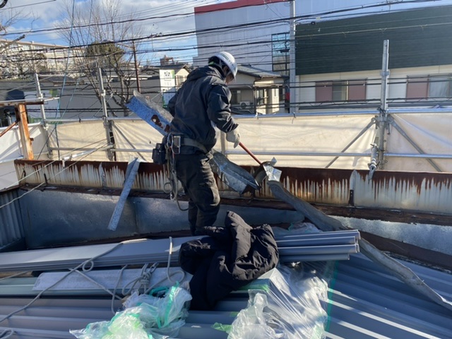 屋根の劣化に伴いカバー工法で施工しました。 トップライトのガラスが割れていたので撤去をしてその部分にも屋根を葺きました。 トップライトは夏場になると室内に太陽光が降り注ぎますし雨漏りの原因にもなりますので、当社では推進しておりません。 追加で外壁のリニューアルもさせていただきました。 オーナー様自作のマークは業者顔負けの出来栄えでした♪